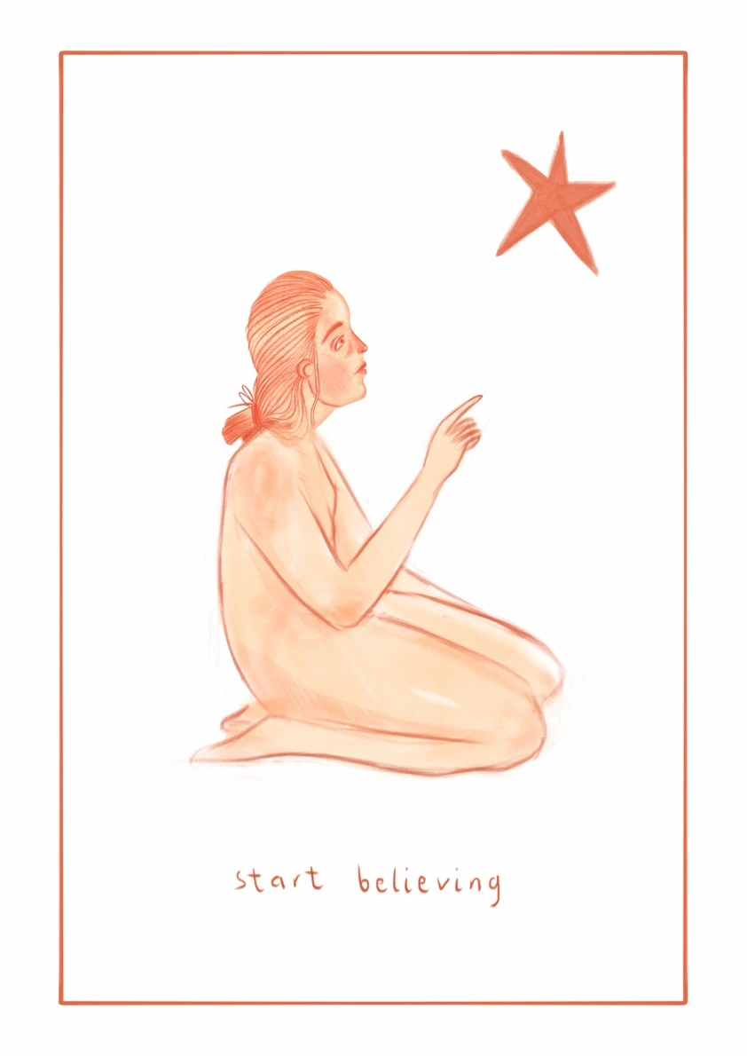„Zacznij wierzyć” to ilustracja o cichym, ale bardzo ważnym momencie. O chwili, w której po raz pierwszy od dłuższego czasu patrzysz w górę — niepewnie, ale już z odrobiną nadziei. O tym jednym tchnieniu gotowości, które poprzedza każdy duży krok.